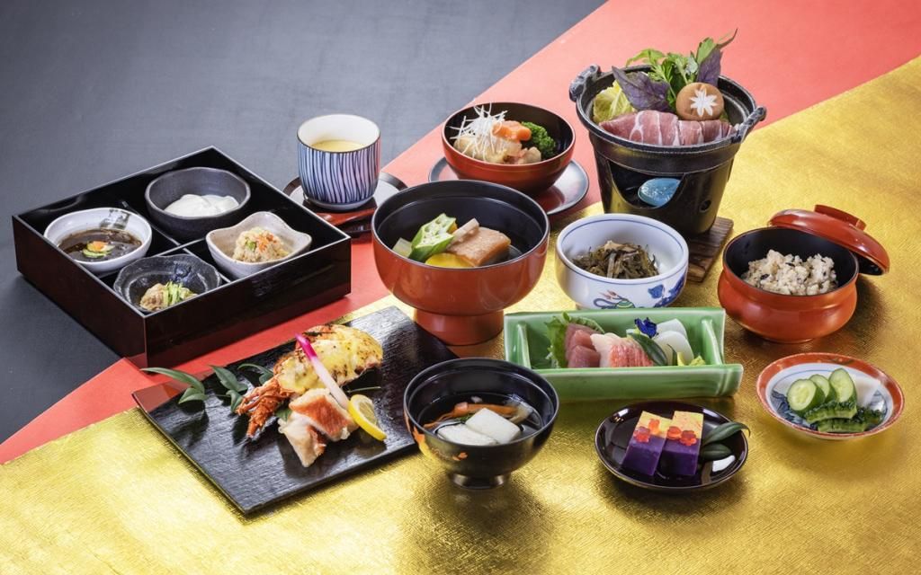 もずく酢・じーまーみ豆腐・卯の花・みみがー・旬海鮮三種盛り・県産金目鯛大根おろし煮・クーブイリチー・らふてぃ 県産野菜炊合せ・てびち鍋(+880円で金アグー豚陶板焼きに変更)・ロブスターと白身魚 島の香りを添えて・茶碗蒸し・じゅうしぃ・県産野菜彩り香の物・冬瓜えび身上葛たたき椀・県産さつま芋羊羹浮島